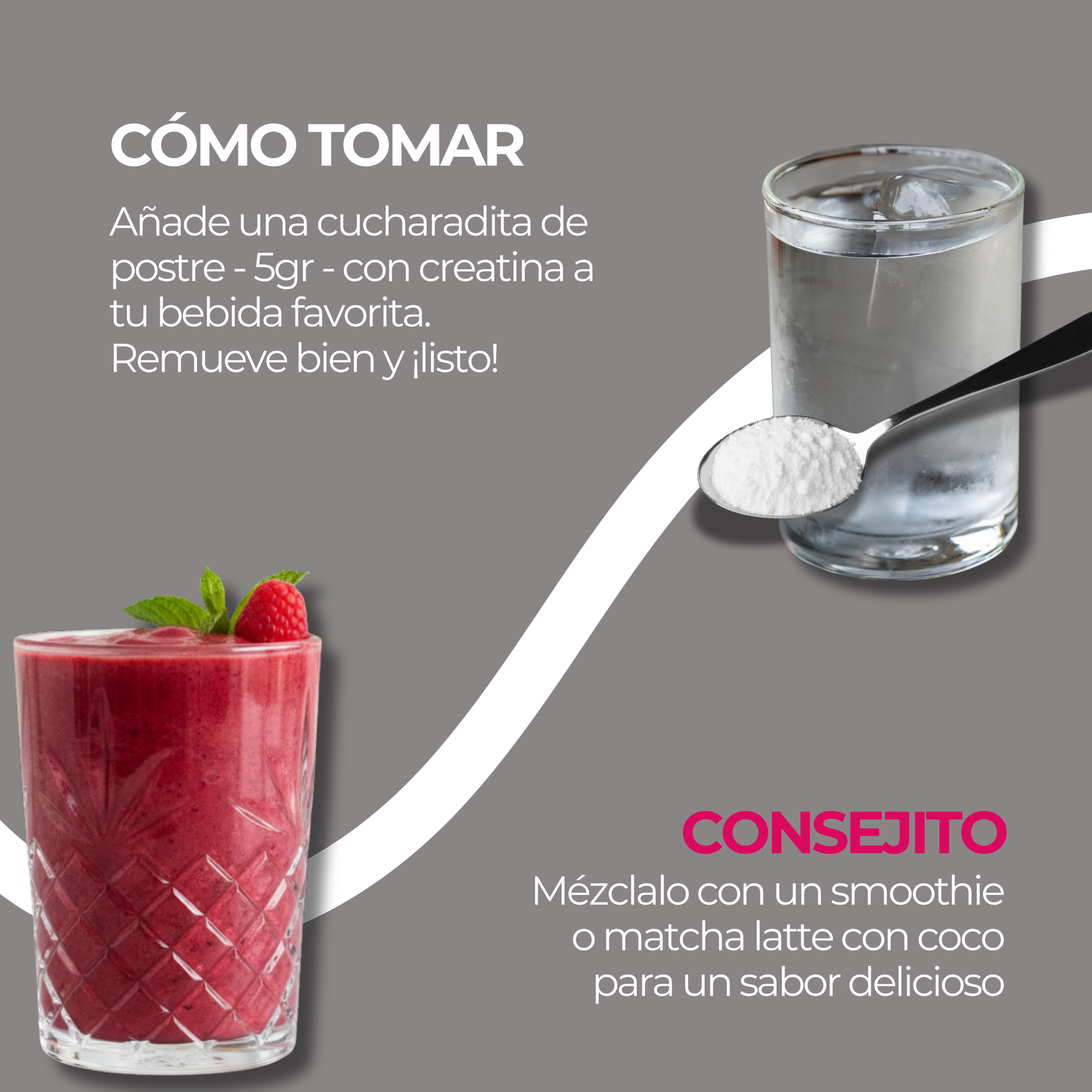 Añade una cucharada de postre (5 gramos) de creatina a un vaso de agua o tu bebida favorita, remueve bien y ¡listo para tomar!